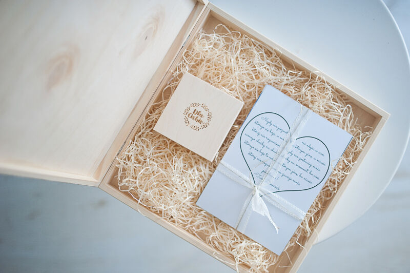 Kiedy odebrałam telefon z prośbą o przygotowanie takiego zestawu, sama byłam podekscytowane, jakby miało to dotyczyć kogoś bliskiego :) Przygotowaliśmy drewniane pudełeczka, 30x30 i 10x10, z grawerami, oraz odbitki ze zdjęć otrzymanych od naszego klienta.